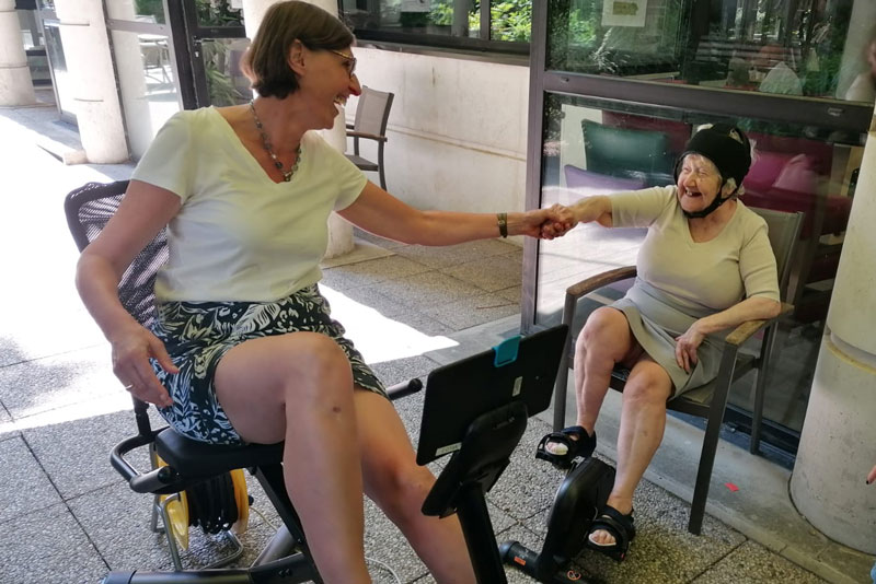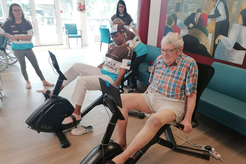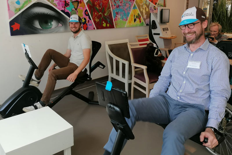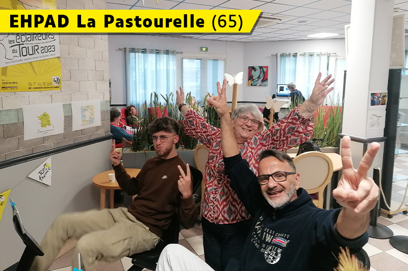 Au total, ce sont près de 250 résidents qui ont pu pratiquer avec leurs familles (75), 180 professionnels des EHPAD et une centaine de personnes extérieures aux EHPAD venues spécialement pour partager au moins une session vélo avec les aînés. Parmi les nombreuses personnes extérieures aux EHPAD, nous avons pu remarquer les contributions d’agents municipaux et de demandeurs d’asile du Prahda du côté de l’EHPAD de Villeneuve les Maguelone, de Véronique LEVIEUX, adjointe au Maire de Paris à l’EHPAD Furtado Heine, des lycéens du Lycée GUTENBERG de Créteil à la maison du Parc, des pompiers et de Thierry LAVIT, Maire à La Pastourelle à Lourdes, de Delphine DUPRÉ-LÉVÊQUE à l’EHPAD Péan, un dirigeant du club d’Issy Triathlon à l’EHPAD Jean ROSTAND, la venue de l’EHPAD voisin à l’Oustau et bien d’autres… tous ont contribué à faire tourner les compteurs et à partager leurs souvenirs vélos avec les résidents.