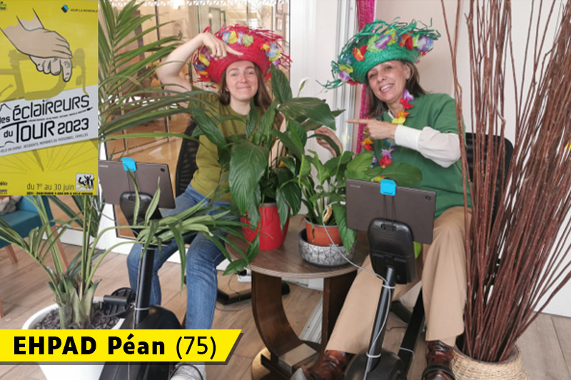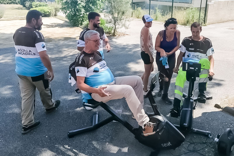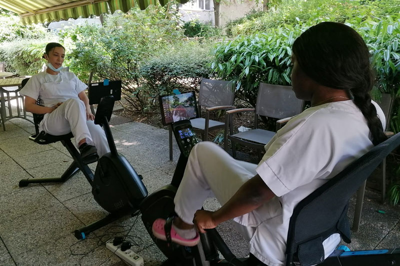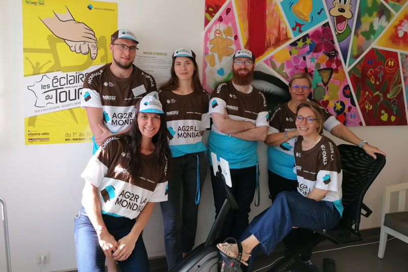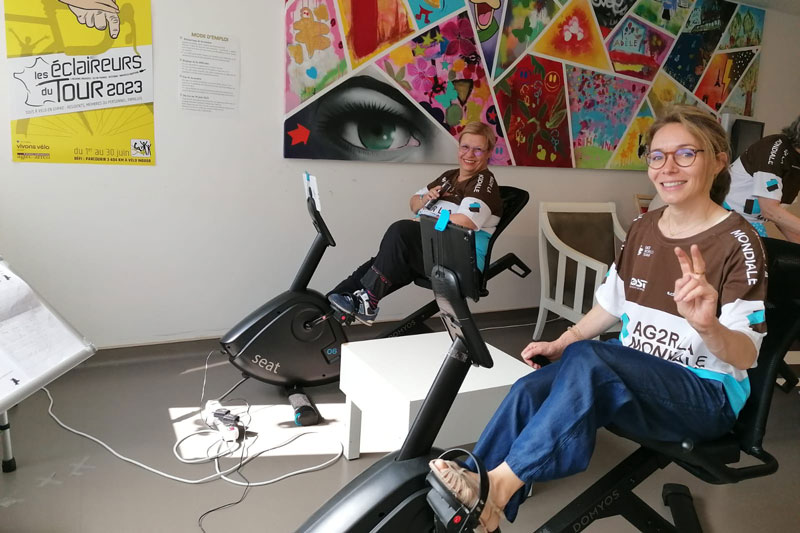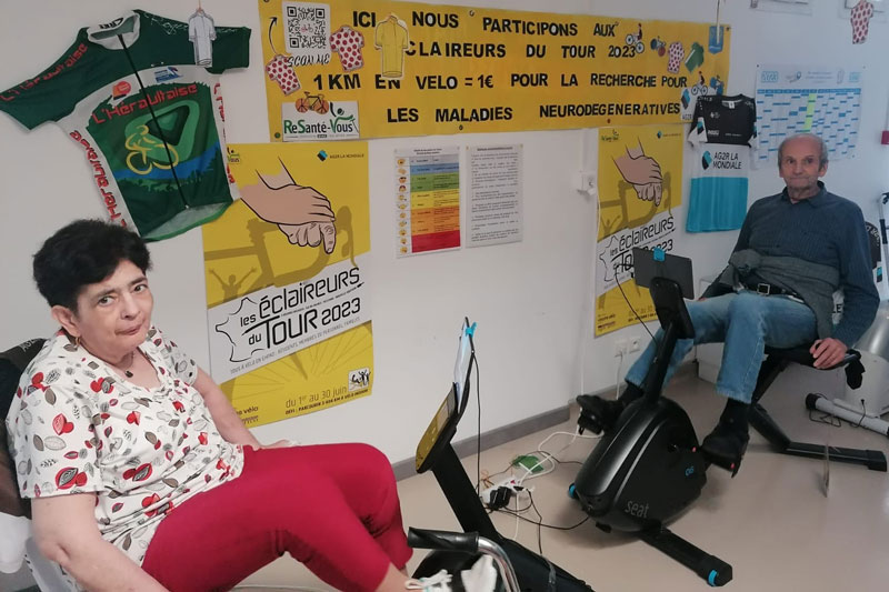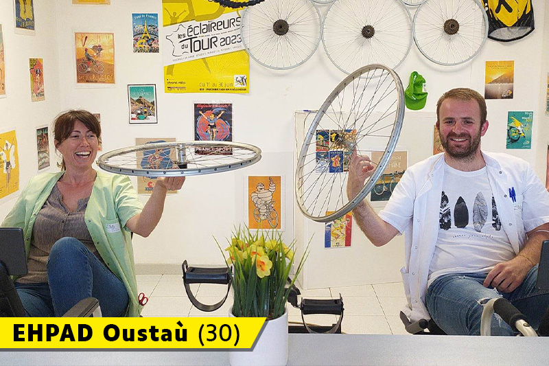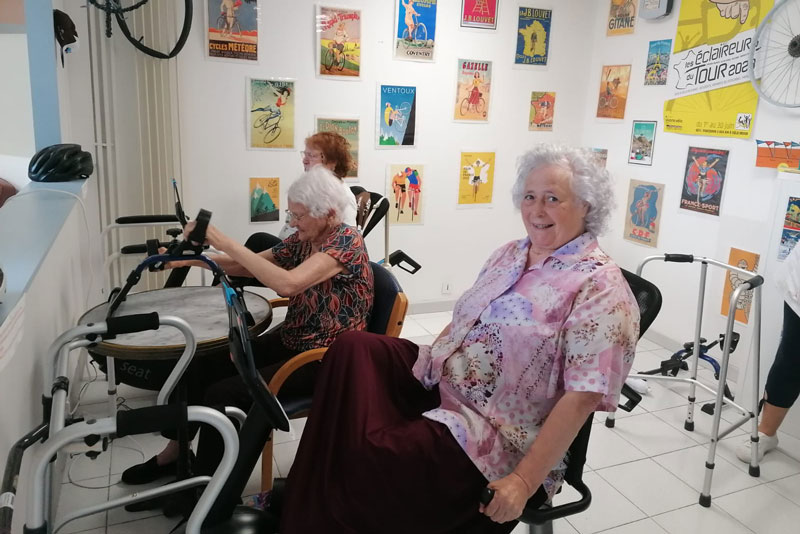 Depuis fin mars, de multiples idées ont émergé au sein des 8 établissements pour créer cette émulation collective autour de la pratique vélo, vectrice de bien-être et d’épanouissement. Des olympiades revisitées en cyclolympiades, des quizz vélo, des expo photos sur l’histoire du Tour, de la pratique individuelle en chambre jusqu’à la pratique collective en extérieur, des challenges pédalage entre résidents et salariés ou contre de jeunes lycéens, sont autant de belles initiatives mises en place par les équipes de référents vélo formées et accompagnées par notre équipe.